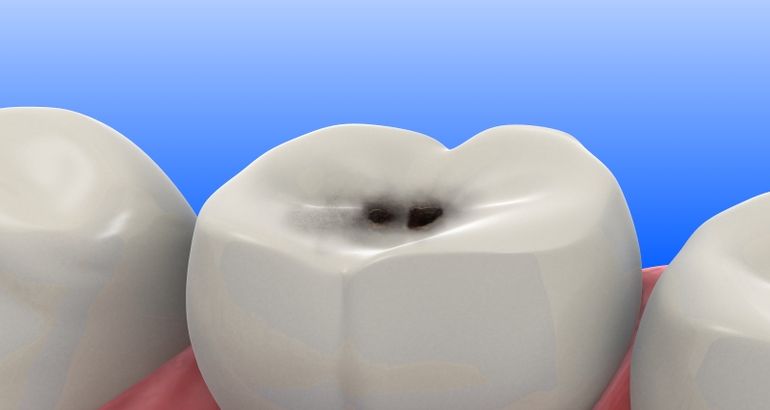 La caries se inicia con una erosión de la capa externa del diente, el esmalte, producida tras la formación de una placa dentaria que en su inicio puede ser una acumulación de azúcar u otros hidratos de carbono.